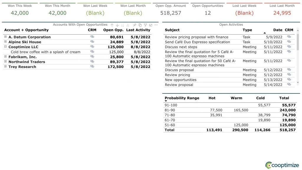 To get people to voluntarily update their Opportunities and Activities, it’s important to maximize the value they get out of CRM. Power BI can play a key role – it’s the best way to summarize CRM data points from multiple tables in a single view.